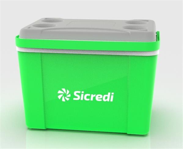 Caixa Térmica livre de bisfenol (BPA Free) com designer moderno, alça de mão articulável, retrátil e laterais embutidas, tampa com trava e porta copos, isolamento térmico em isopor, disponível em diferentes cores, com capacidade para 12 litros e tamanho aproximado 35,3 x 24 x 27 cm.
