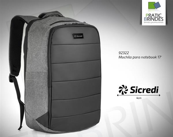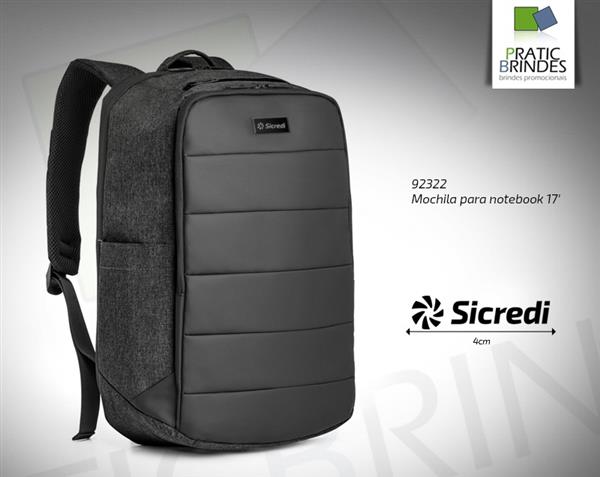 Mochila para notebook em 300D com placa de metal preta personalizável e dois compartimentos principais. Os dois bolsos almofadados são compatíveis com computador até 17" e com um tablet de 9,7". Tem ainda mais dois bolsos nas alças (1 com zipper), bolso oculto nas costas da mochila com zíper, bolso no topo com zíper e bolso aberto na lateral com elástico no topo. Contém ainda tira de transporte para trolley e alças e parte posterior almofadadas. Gravação a laser na placa metálica. Tamanho aproximado: 310 x 480 x 130 mm