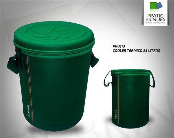 Cooler térmico com capacidade de 23 Litros, Revestido com Helanca Light, Revestimento térmico em isomanta, Forro interno de Bagun Espelhado 0,30. Alça de 40mm. Tamanho 34 x 26 x 26. Personalização em Serigrafia e Alto Relevo na tampa. A tag de papel, desenvolvida para a nova coleção, acompanha esse item.
