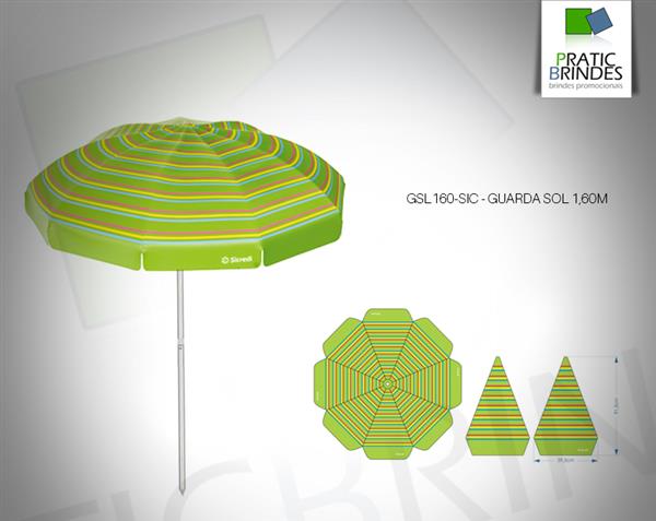 Guarda Sol com haste central em alumínio, varetas em aço 1060, 3,8mm bi cromatizadas, com revestimento em lona emborrachada (PVC) de trama poliéster, no tamanho de 1,60m de circunferência. Personalizado em Serigrafia, com logo Sicredi em 4 gomos alternados. A tag de papel, desenvolvida para a nova coleção, acompanha esse item.